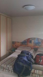 We wonen niet in een tent maar in een mobile home, of op z’n Nederlands een stacaravan. Uiteraard niet de nieuwste en meest luxueuze van de camping, maar toch zeker beter dan een tent. Deze mobile home compleet in jaren negentig style (gebouwd in 2001, huh?) is best handig ingedeeld, we hebben gigantisch veel bergruimte, kastjes, een rommelkamer en een beste zithoek.